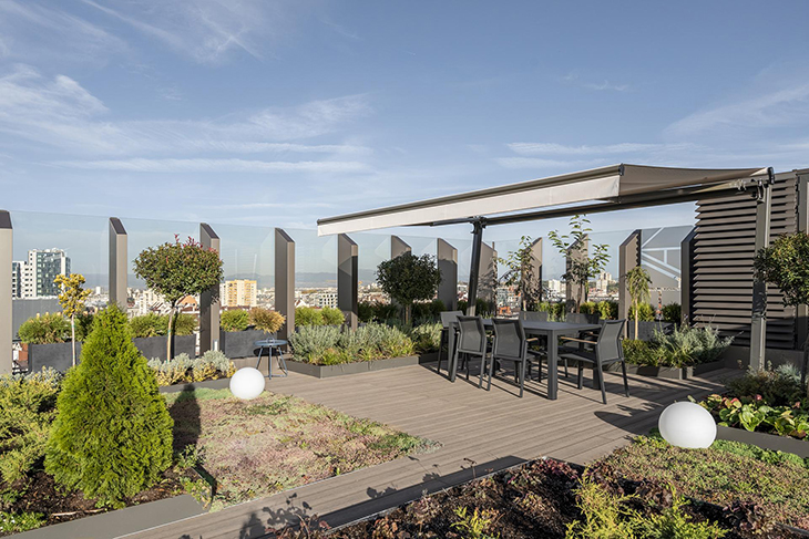Покривното озеленяване на сградата създава модерно пространство за отдих чрез иновативен дизайн и устойчиви материали. Въпреки наклонения терен проектът успешно интегрира седумни килими, декинг и декоративна растителност. Покривната градина е пример за хармония между технология, дизайн и екология – проект, който обогатява градската среда и доказва, че зелените покриви са бъдещето на устойчивата архитектура.