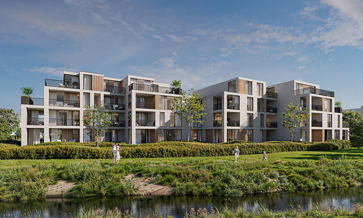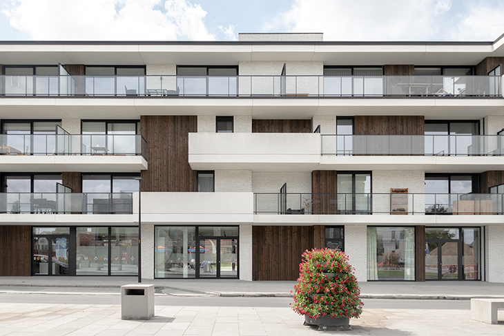 Този белгийски жилищен комплекс съчетава чиста геометрия и естествени материали като тухла и дърво за постигане на модерна елегантност. Отворените интериори и големите остъклявания осигуряват максимална светлина и плавна връзка с природата. Зелените покриви и споделените дворове създават устойчива среда, вдъхновена от характерния белгийски стил.