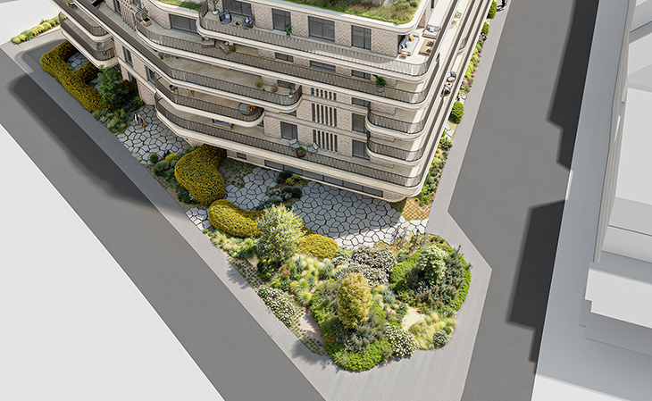 Тази модерна жилищна сграда постига баланс между устойчивост и естетика чрез фасада от естествен камък, стъкло и метал. Светлите интериори са свързани с богатите зелени площи и покривни градини, осигуряващи максимален комфорт. Проектът предлага хармонична градска среда, обединяваща функционалност и съвременен дизайн.