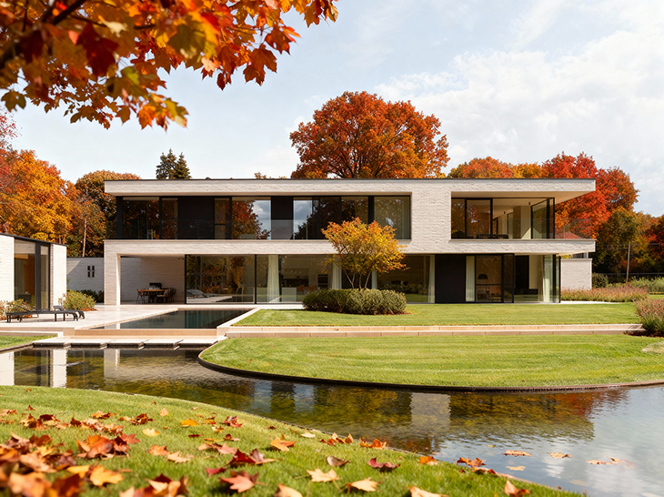 Тази модерна къща съчетава изчистен минимализъм с безупречна връзка между светлия интериор и градината. Фасадата от светла тухла допълва функционалните обеми, преливащи към открития басейн и терасата. Естествените материали и просторните остъкления създават комфортен дом, в който вътрешните пространства и екстериорът съжителстват в хармония.