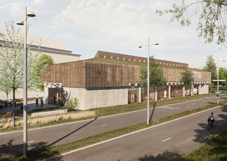 Новата станция на Червения кръст във Виена съчетава партерен етаж от видим бетон за оперативни дейности с етаж за отдих с дървена конструкция. Издълженият силует със скатен покрив и оберлихт осигурява разпознаваемост и функционално разделение на пространствата. Устойчивият дизайн залага на сглобяеми елементи, гарантиращи ефективност и хармония с околната среда.