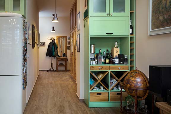 Проектиран е специален алкохолен шкаф за любителя барман. За максимално функционално оползотворяване в него са заложени различни по функция и вид обеми - подвижни кошнички, чекмеджета, клапващи врати, рафтове за бутилки. Миксът от материали в кухнята е използван и в този шкаф. Така, макар и на отделни стени, те са визуално обединени.