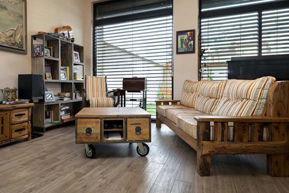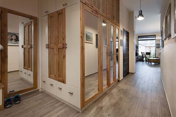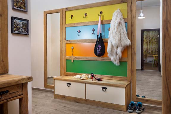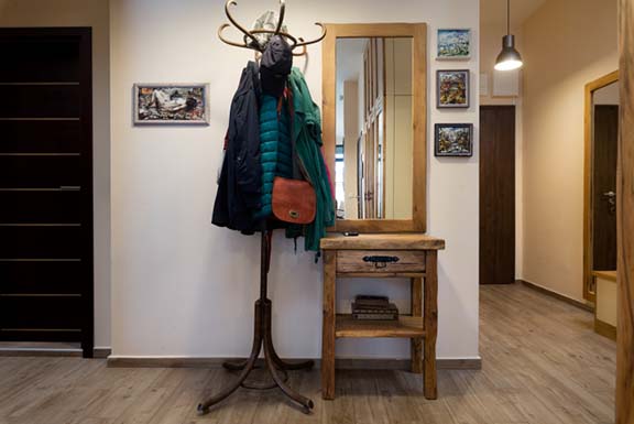 Конзола и огледало са в олекотена дъбова версия, а закачалка във виенски стил допълва ретро нотката на антрето.