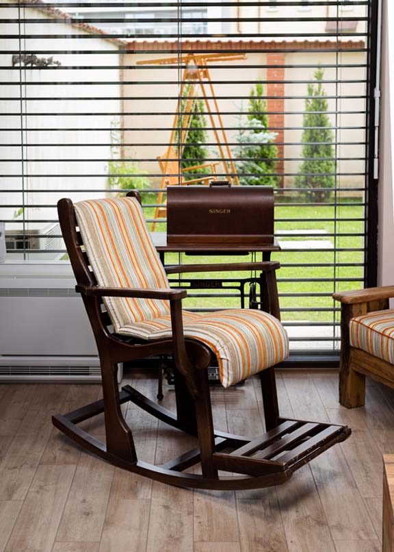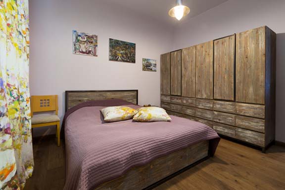 Спалнята е очарователна комбинация от модерни очертания и състарени ефекти на материалите. Следи от четки се шарят по мебели, картини и пердета. Всички те - обединени от любовта към изкуството.