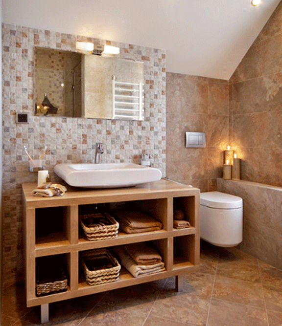 Водещото при създаването на този интериор и усещането му за близост с природата е съчетанието на дърво с облицовка в мотиви от естествен камък в топли земни цветове, които допълнително подчертават усещането за уют.