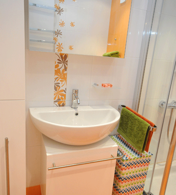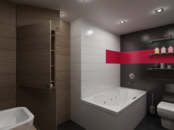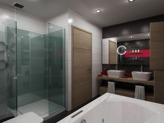 Авторският колектив е следвал идеята за различна баня с изчистена визия, без да забравя и функционалността на помещението, поставяйки и пералня в него. Едновременно с това е помислено и за удоволствието и релакса след тежък ден, постигнат чрез съчетанието на душкабината, огледалата и хидромасажната вана.