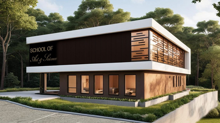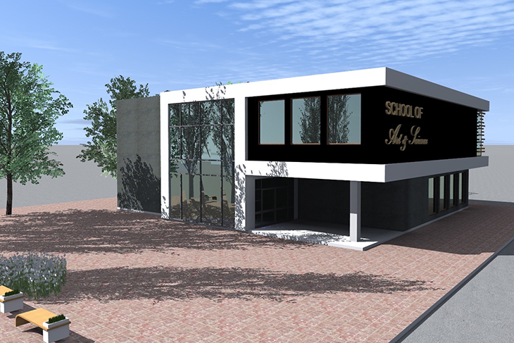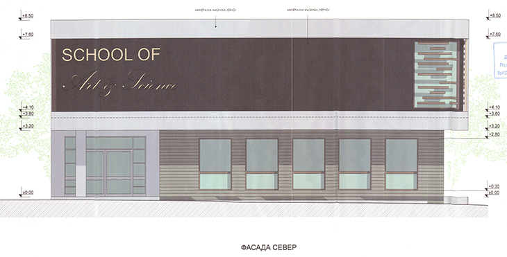 Големите витрини на първия етаж позволяват проникване на естествена светлина, което подобрява вътрешната осветеност и създава визуална връзка между външното пространство и учебните зони. Големият черен панел, интегриран в фасадата на горния етаж, е проектиран за поставяне на надпис или лого. Пространствата около обекта ще са покрити с павирани настилки.