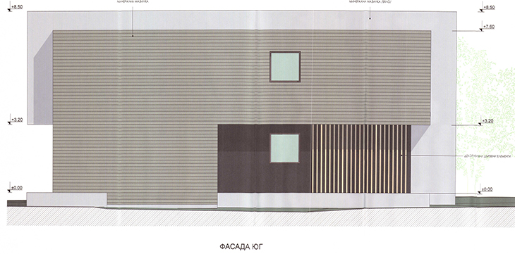 Фасадите ще комбинират големи стъклени панели, метални елементи и топлоизолационни материали. Панорамните прозорци на залата за събития подчертават облика на сградата и осигуряват максимално естествено осветление. Основната облицовка ще бъде изпълнена с минерални мазилки с топлоизолационен слой, а в определени зони на фасадата са предвидени и декоративни дървени обшивки.