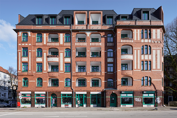 Dachaufstockung und Sanierung einer denkmalgeschützten Wohnanlage (Разширение на покрива и обновяване на жилищен комплекс паметник на културата) в Хамбург