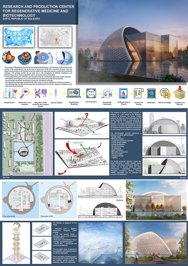 Проектът разглежда ролята на архитектурата в съвременната биомедицина – област, в която човешки тъкани и органи се създават и възстановяват чрез генетично редактиране, клетъчно инженерство и 3D биопринтиране. Предложената концепция обединява научни изследвания, лаборатории и производствени мощности в единна функционална система. Водещата архитектурна идея е образът на „живия организъм" – технологично ядро, в което протичат ключовите биотехнологични процеси, обвито в защитна мембранна структура, осигуряваща контролирана и устойчива среда за биомедицински дейности.