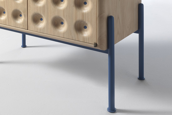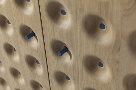 "Порите" са допълнени със семпли цветни детайли, придаващи скулптурен обем на интересния и функционален дървен шкаф.