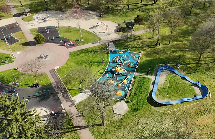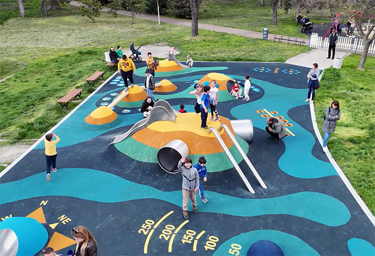 Новото съоръжение съчетава зони за катерене и баланс, пързалки и тунели, както и разнообразни фигури и 3D елементи, вградени в самата настилка. Изградени са и специални хълмове върху съществуващата бетонова площадка.