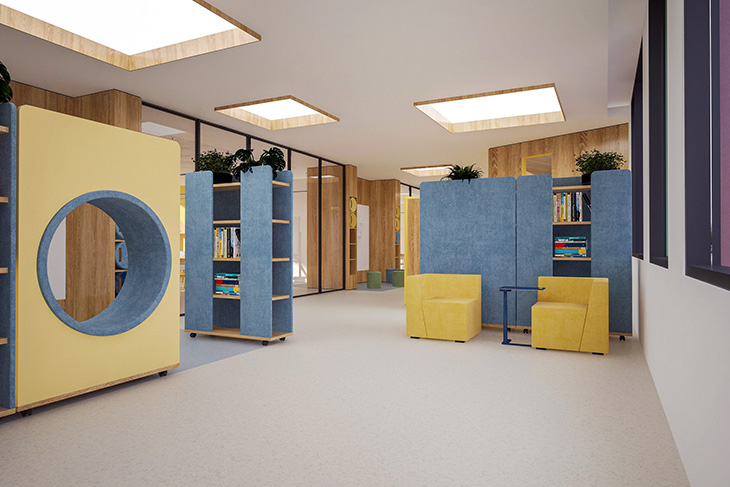 В интериора е заложена палитра от меки тонове, които създават усещане за сигурност, спокойствие и емоционален комфорт. Фоайето ще е свързано с библиотеката на две нива - за тиха и по-шумна зона, проектирана като добре осветена, леснодостъпна и подходяща за деца от всички възрасти.