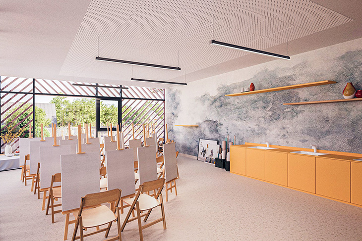 Сградата ще има учебни студиа за 980 ученици, като те ще могат да се обединяват със съседни или да се разделят на малки, средни или големи групи за различни режими на учене, а част от тях се отварят и към коридора за допълнително пространство. Концепцията намира най-ярко отражение в многофункционалните зони, които стимулират условия за индивидуални и колективни занимания, игра, комуникация и движение. Функционалната схема на проекта залага на максимална гъвкавост на пространствата чрез преместваеми мебели, сгъваеми преградни стени, завеси и мобилен инвентар. В учебните студиа ще доминира белият цвят като светла и неутрална основа, допълнена от пастелни нюанси на синьо, жълто и зелено.