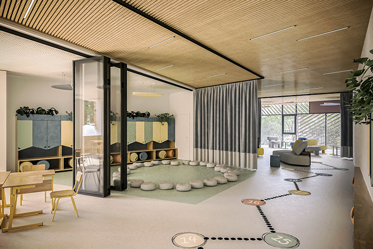 Както библиотеката, така и ресторантът с кухня ще могат да се отварят към фоайето и ще се използват в извънучебно време. В общите пространства са заложени по-наситени цветове и ярки акценти, които подпомагат визуалната ориентация, активират сетивата и изграждат динамична, ангажираща среда. Цветовата гама е синхронизирана с екстериора и еволюира във височина, отразявайки възрастовите групи и функциите на всяко ниво.