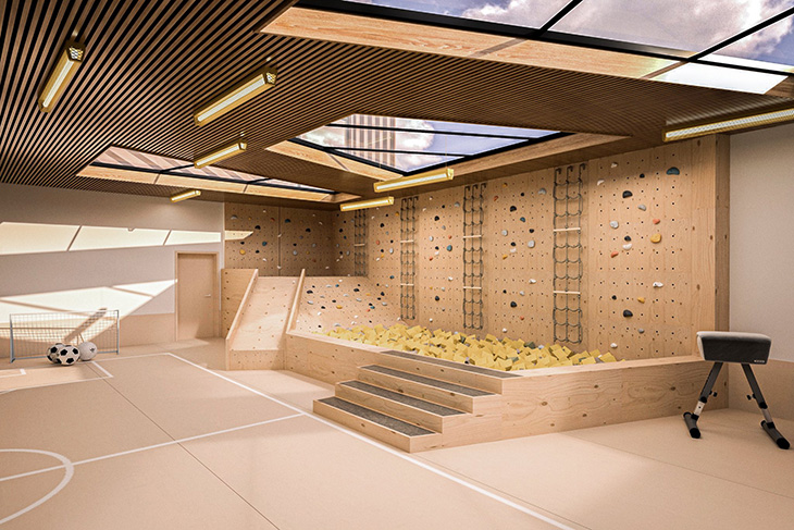 Освен физкултурния салон и басейна, зоната за спорт включва още малък салон със стена за катерене с пързалка, басейн с дунапренени кубчета, зона за разтягане и загрявка с шведски стени, огледала и подвижни модулни скамейки.