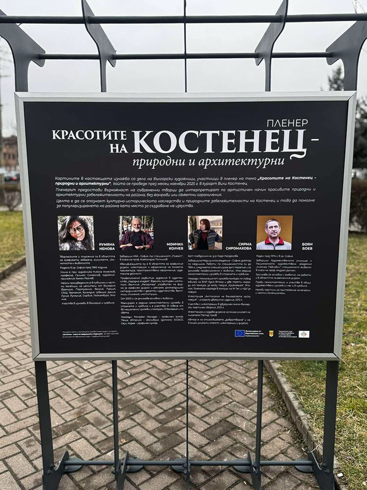 Художници уловиха духа на Костенец и превърнаха неговото културно-историческо наследство и природни богатства в изкуство. Проектът цели да накара жителите да преоткрият познати местности и да утвърди Костенец като туристическа дестинация за творчество и вдъхновение. Пленерът и изложбата са реализирани по проект „Костенец-сцена на традициите и бъдещето“, финансиран от Европейския съюз.