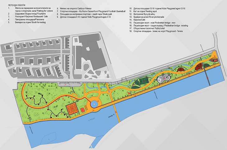 За дългата тясна ивица общинска земя между комплекса и река Искър едни от проектантите на комплекса са изработили идеен проект