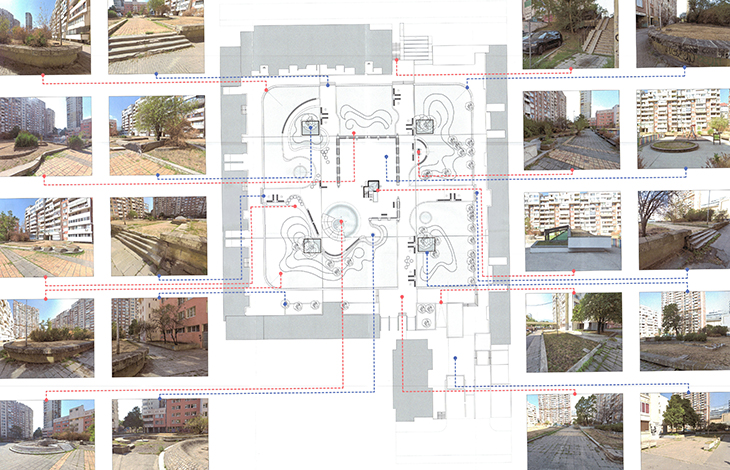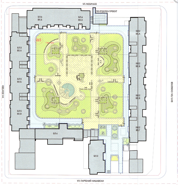 Междублоковото парково пространство в Зона Б-5 граничи на север с ул. Позитано, на юг с ул. Партений Нишавски, на запад с ул. Осогово и изток с бул. Ген. Скобелев. Проектант в част „Архитектура“ е арх. Павел Ангелов. Проектът предвижда подмяна на настилки, обособяване на подходи със стълби и рампи, обособяване на пространства за отдих и социализация, детски площадки за две възрастови групи, сух фонтан, зона за шах, парково осветление и обзавеждане, подновяване и реновиране на облицовките на фонтана, който ще остане сух, без да се възстановява работата му, достъп до подземните паркинги под площадното пространство и др.
