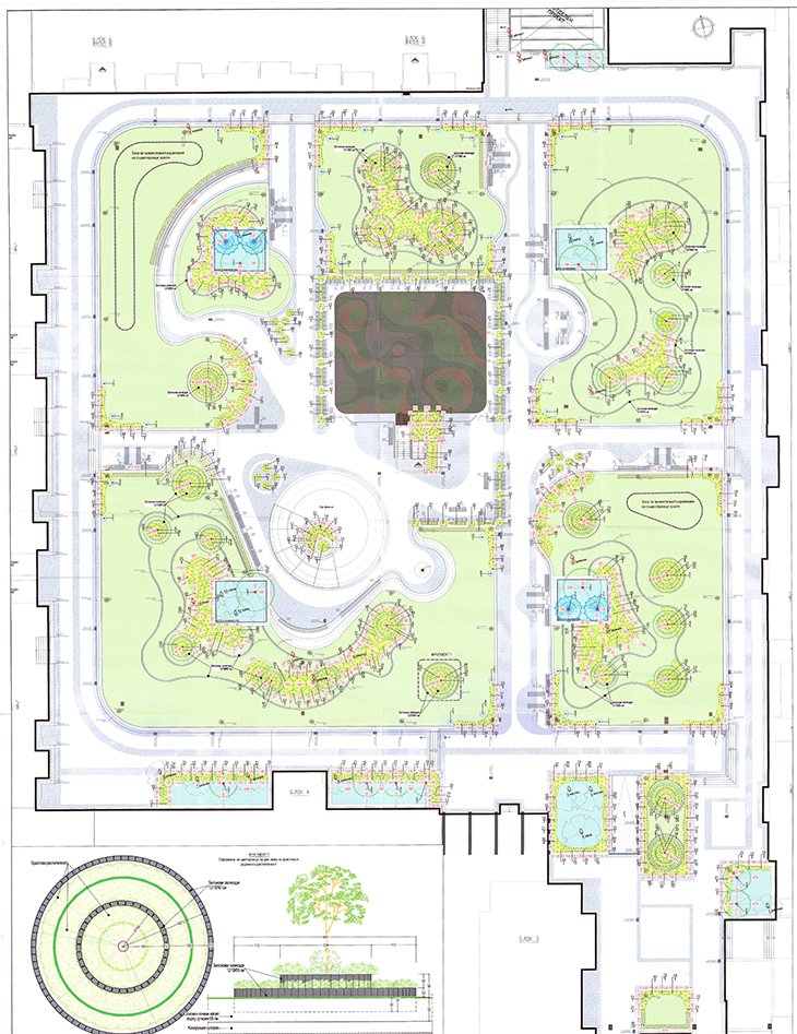 Проектант в част „Паркоустройство и благоустройство“ е ланд. арх. Йордан Караколев. Проектът ще обогати зелените площи, разположени върху покрива на подземния гараж. Предвиждат се нови групи дървесна растителност, за които е необходимо да се осигури по-дебел почвен субстрат. Тези зони ще са оформени с палисади с нова конфигурация и ще са подчертани с LED осветление. Ще бъдат използвани устойчиви и ниско поддържащи се растителни видове.