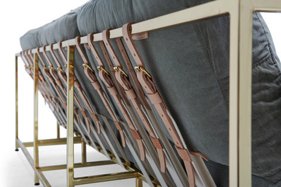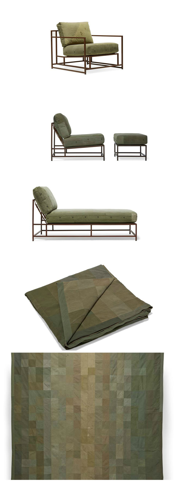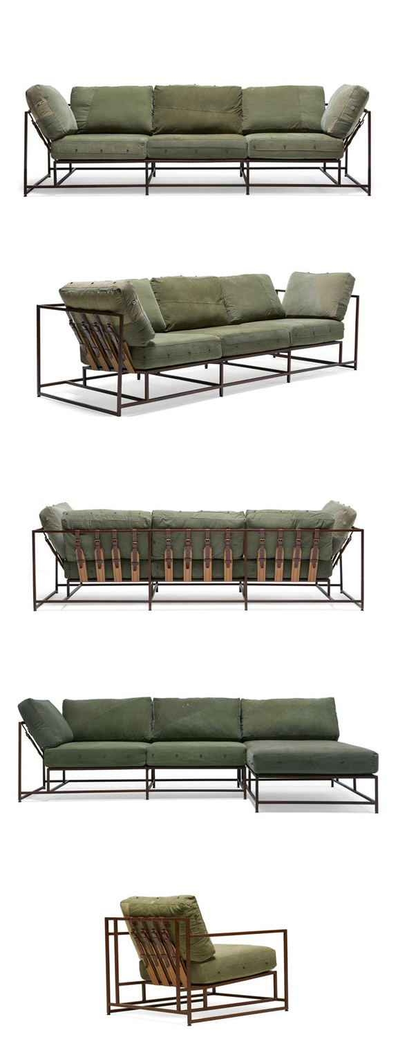 The Inheritance Collection е изработена от стоманена рамка с покритие от полиран месинг, кожени колани и повторно използван военен плат за тапицерията. Всяка част от тъканите е уникална и има малки несъвършенства.