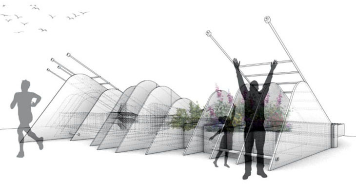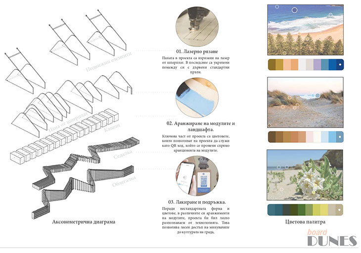 Проектът предлага модулна трансформираща се система, която оформя вълнообразни „дюни“ за отдих и социални контакти, а при необходимост се превръща в уреди за упражнения. Концепцията включва и културен елемент чрез вградени кодове, свързващи посетителите с локално изкуство и съдържание, посветено на спорта и здравословния начин на живот.