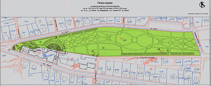 Сградата на центъра е предвидена в долния ляв ъгъл на терена (в червено). Вижте и тук.