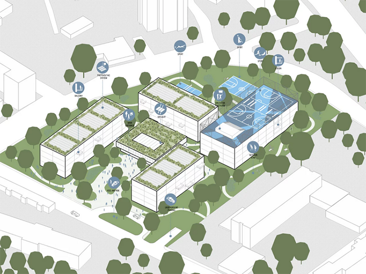 Предвидена е и многофункционална зона на училището, включително училищен форум, аудитории и сектор за извънкласни дейности, сектори за хранене, спорт и изкуства, голяма зала за компютърни обучения, STEM пространства. Всяко ниво има достъп до открити пространства под формата на лоджии или балкони, които позволяват ученици и преподаватели да излязат на чист въздух по време на междучасията или да провеждат уроци, занимания по групи или индивидуална работа на открито. Предвидено е в базата да се обучават 1 350 ученици, а учителският и обслужващият персонал да бъде 150 души.