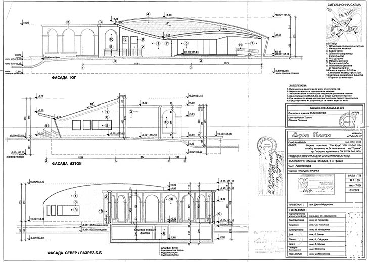 Откритата сцена с обслужваща сграда ще бъде разположена във водното пространство, без да се налага като масивен обем. Радиално на нея ще бъдат ситуирани открита амфитеатрална трибуна и две изгледни площадки. Обслужващите помещения са проектирани в самостоятелна сграда зад сцената във формата на листо и почти изчезват зад сценичната аркада, като по този начин ще се откриват визуални връзки от североизток и югозапад към водната площ с две геопластики, казват проектантите.