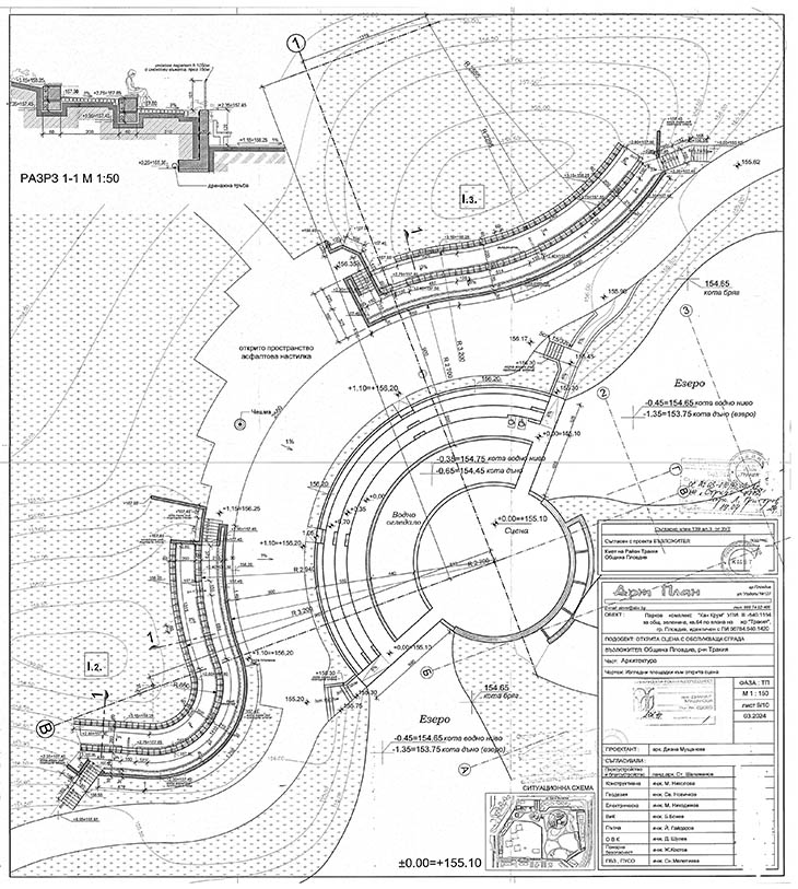 Местата за зрителите ще се разположени амфитеатрално, като обемът на трибуната ще следва конфигурацията на терена и ще използва наклона и естествените уширения. Структурата на сцената ще се състои от открити и закрити пространства с обособяване на обществено достъпна зона, където да се организират различни мероприятия. Амфитеатралната трибуна ще е за 194 седящи места на три реда, като между нея и сцената ще е разположено водно огледало. Достъпът от трибуната до сцената ще се осъществява с две мостчета, разположени диаметрално в двата края. Двете изгледни площадки за 95 и за 87 седящи места ще са максимално отдръпнати зад и над амфитеатъра за постигане на максимална видимост към откритата сцена.