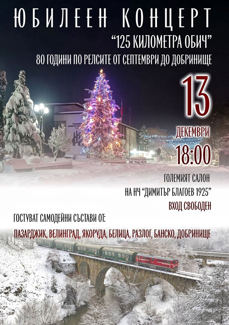 Във връзка с 80-годишнината от откриването на последната отсечка от Родопската теснолинейка е организиран и концерт-спектакъл "125 км обич - 80 г. по релсите от Септември до Добринище" с участието на самодейни творчески колективи от Пазарджик, Велинград, Якоруда, Белица, Разлог, Банско и Добринище. Концертът ще бъде на 13 декември (събота) от 18:00 часа в големия читалищен салон в Добринище. Входът е свободен.