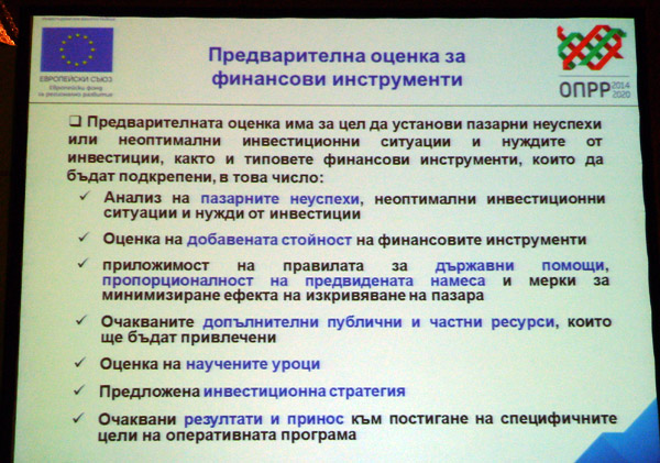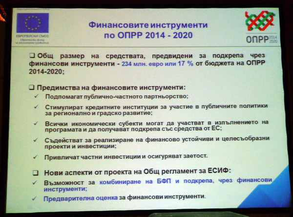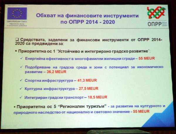 По време на дискусионния форум Еудженио Леанца, отговарящ за програма JESSICA и инвестиционните фондове в Европейската инвестиционна банка, говори за най-важните европейски инструменти в подкрепа на градовете. За опита на Гърция с градските финансови инструменти разказа Апостолос Пападопулос, ръководител „Правителство и инфраструктура" (Partner Grant Thornton), а Димитър Черкезов, главен сътрудник по управление на европейски проекти и програми в Главна дирекция "Програмиране на регионалното развитие" в МРР, разказа за оперативна програма "Региони в растеж".