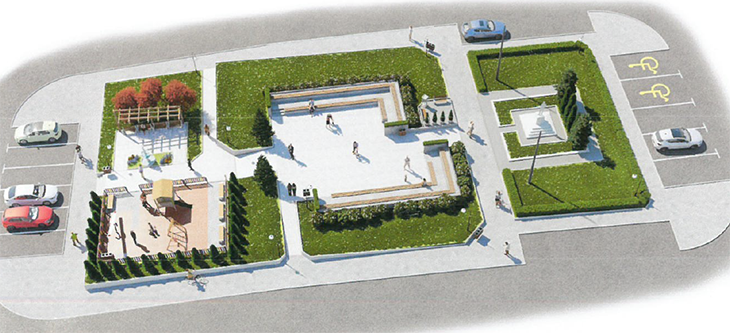 Визуализация с предвиденото озеленяване и цялостния облик на площада