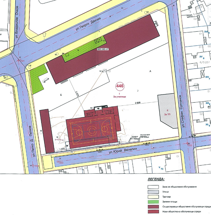 Проектант в част "Архитектура" е арх. Тихомир Ташков. Проектът предвижда да бъде премахната една от неизползваемите дървени конструкции в двора на училището. Проектът предвижда изграждане на нов физкултурен салон на един етаж с площ от 694,32 квадратни метра. Сградата ще бъде изградена с носеща метална конструкция, с леки пенополиуретанови ограждащи елементи и покритие на покрива с термопанели с минерална вата с дебелини 10 см. Предвидено е да има висока част за физкултурен салон и ниска – за обслужващи помещения.