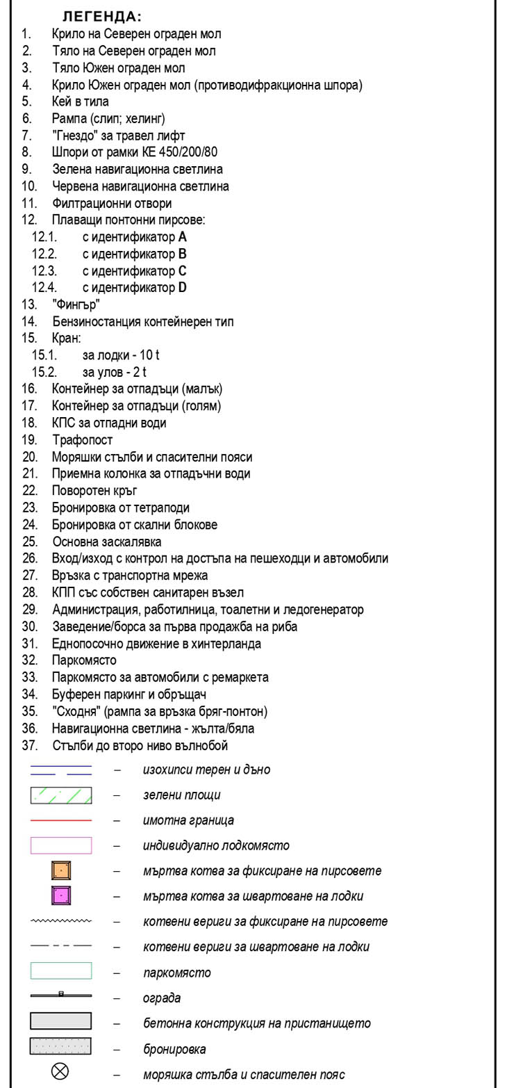 Освен това ще има още и приемна колонка за събиране на отпадъчни води от плавателните съдове, контейнери за отпадъци (малки и големи), канална помпена станция (КПС) за препомпване на отпадъчните води в градската канализация, трафопост, зелена площ, ограда, осветление и видеонаблюдение.