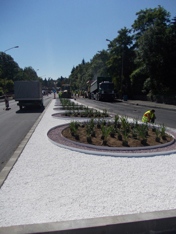 Централният остров се оформя с цветен камък. Общата ширина на лентите в кръговото движение е 9 м. И в трите вход-изходи на разделителното кръстовище се изграждат разделителни острови с цел подобряване организацията на движение.