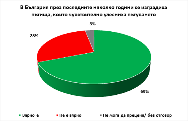 69% смятат, че пътуването у нас се е улеснило чувствително от строителството на нова инфраструктура. Повечето шофьори вече са запознати с предстоящото въвеждане на електронна система за таксуване при използване на републиканската пътна мрежа. Предвижда се от 1 януари 2019 г. да се премине към електронна винетка за леките коли до 3,5 тона, а от август догодина - към тол за изминато разстояние на превозните средства над 3,5 тона. При въвеждането на нова система съществуват закономерни притеснения за възможно повишаване на цени, но българите като цяло по-скоро възприемат спокойно принципа на нововъдението, а именно: цените за леките автомобили да останат същите, а за тежкотоварните да се повишат.