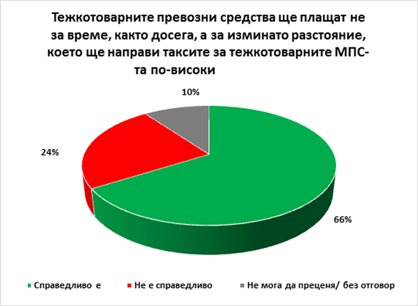 66% смятат за справедливо тежкотоварните превозни средства да плащат не за време, както досега, а за изминат път, въпреки че това ще направи таксите за тях по-високи. 24% са на обратното мнение, а останалите се колебаят. Това е всъщност основният принцип на новата система за таксуване, която включва електронни винетки за леките автомобили и тол за изминато разстояние за тежкотоворните над 3,5 тона. Данните кореспондират и с подобно изследване преди година.