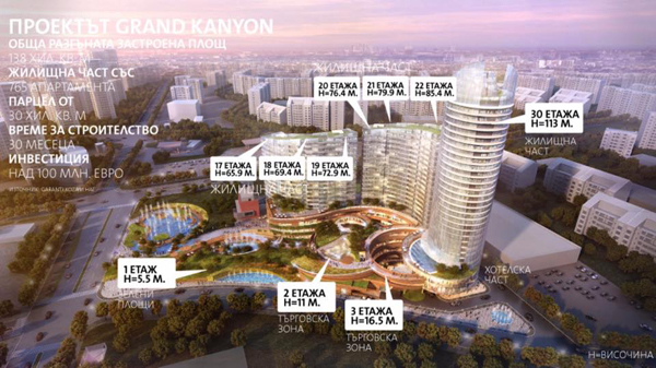 Инвеститорът „Гаранти-Коза България" има амбиция да превърне терена на бившия магазин „Нова Деница" в зона за обитаване, разходки и услуги. „Гранд Каньон" ще обедини жилища, хотел, мол, офиси, културна сцена (амфитеатър) и паркова среда. Архитектурата на Jerde Partnership е повлияна от подобни комплекси в Истанбул и Токио, съобщи www.economic.bg.