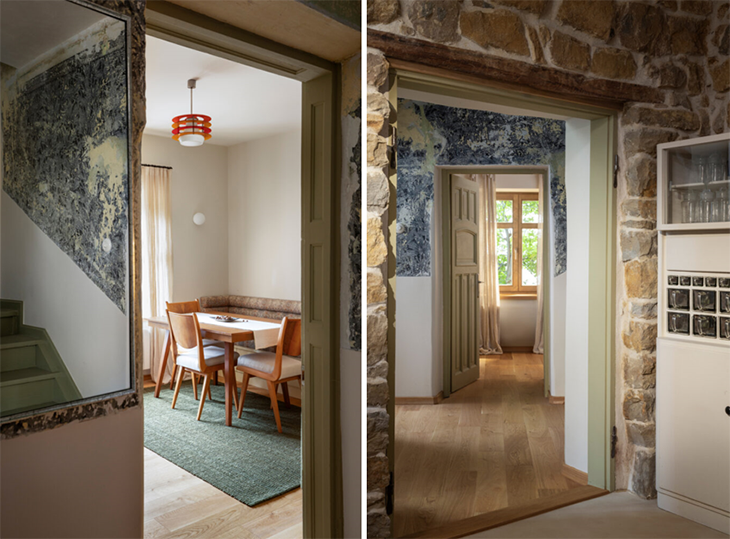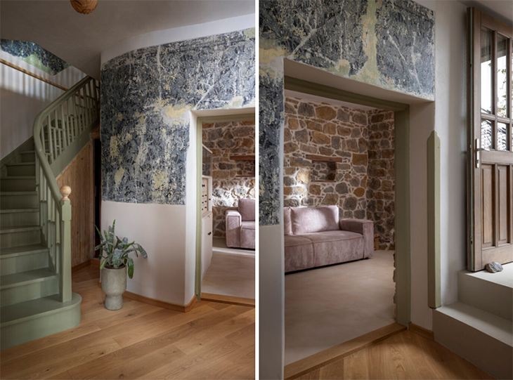 След махането на тапетите по стените са се разкрили впечатляващи слоеве от три етапа на декорация, изпълнени с шаблони и орнаментни валяци - вече споени в неделима амалгама и колорит. Където състоянието им е позволявало, те са укрепени и консервирани и се превръщат в едни от разказвачите на историята.