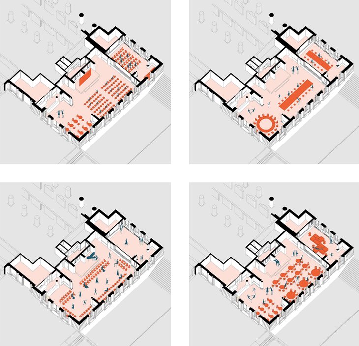"Подобрената планова схема играе централна роля в успеха на проекта. Ходовите линии са оптимизирани, което позволява на посетителите и персонала да се движат плавно в пространството. Структурните и програмни корекции увеличават адаптивността на мястото, което му позволява да побира широк спектър от културни събития – изложби и представления, лекции и фестивали. По този начин проектът въвежда отново гъвкавостта като основна характеристика на партерния етаж на Двореца", казват още авторите на проекта.