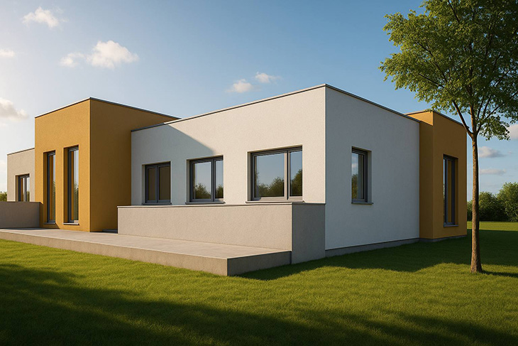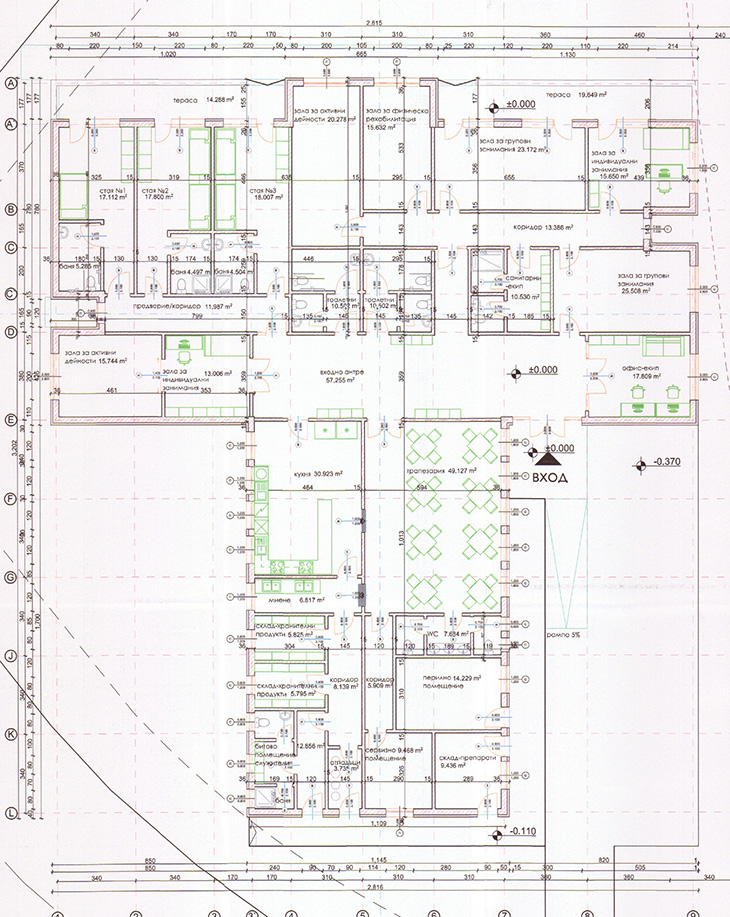 Габаритните размери на сградата са 30 на 24 метра и максимална кота било +4.40м. Разпределението на сградата е съобразено с изискванията, зададени от Министерство на труда и социалната политика. Всички указания и изисквания за вид, площ и достъп за помещенията са изпълнени с проекта.