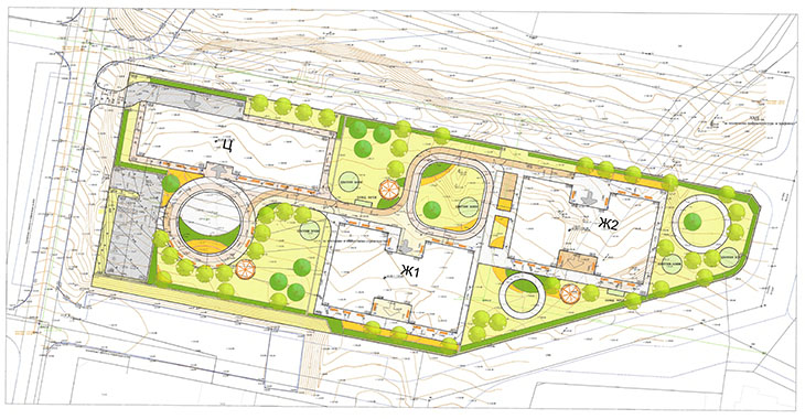 Проектант в част "Паркоустройство и благоустройство" е ланд. арх. Александър Недев. Дворните пространства ще бъдат организирани за занимания на открито и отдих. Осигурени са 8 паркоместа (1 за лица с намалена подвижност). Предвижда се лека ажурна ограда по границите на парцела и между сградите. Алейната мрежа ще е достъпна за хора с увреждания.