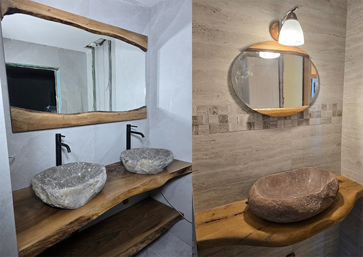 На ЕКСПОМЕБЕЛ 2026 ще видите и много решенията за банята. Комплект например съчетава каменен умивалник с органична форма, плот от масивно дърво и огледало с дървени акценти. Тази комбинация създава усещане за уют и природна елегантност, подходяща както за модерни бани, така и за СПА пространства с висок клас на изпълнение.