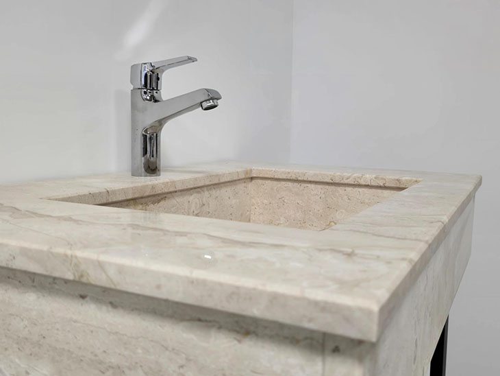 Каменен умивалник с плот с минималистична визия е предназначен за стенен монтаж, което създава усещане за лекота и простор. Прецизната обработка на естествения камък подчертава неговата автентичност и превръща всеки модел в уникален елемент от интериора.