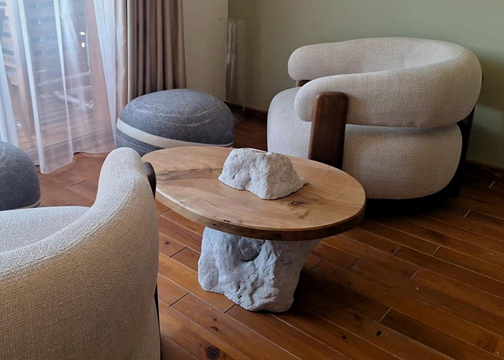 Запомнящ се акцент в интериора внася скулптурирана маса за кафе от американски орех, с основа пиедестал от 11 слепени плота, оформена изцяло на ръка - без струг. Впечатляваща с визията си е и маса, създадена с иновативни материали и технологии, комбинирайки естествено дърво и епоксидни дизайни. Може да преобразите пространството и с холна маса, която съчетава естествен камък и масивно дърво в композиция, вдъхновена от природните форми. Дизайнът създава усещане за хармония и естественост в интериора, а ръчната изработка гарантира, че всяка маса има собствен характер и уникална визия.