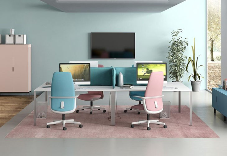 За офиса може би е най-подходяща серия работни системи с извита метална структура, минаваща над плота. Предлага се с нестандартни опции, като акустична преградна завеса, вградено осветление, цветарник и метална полица над плота.