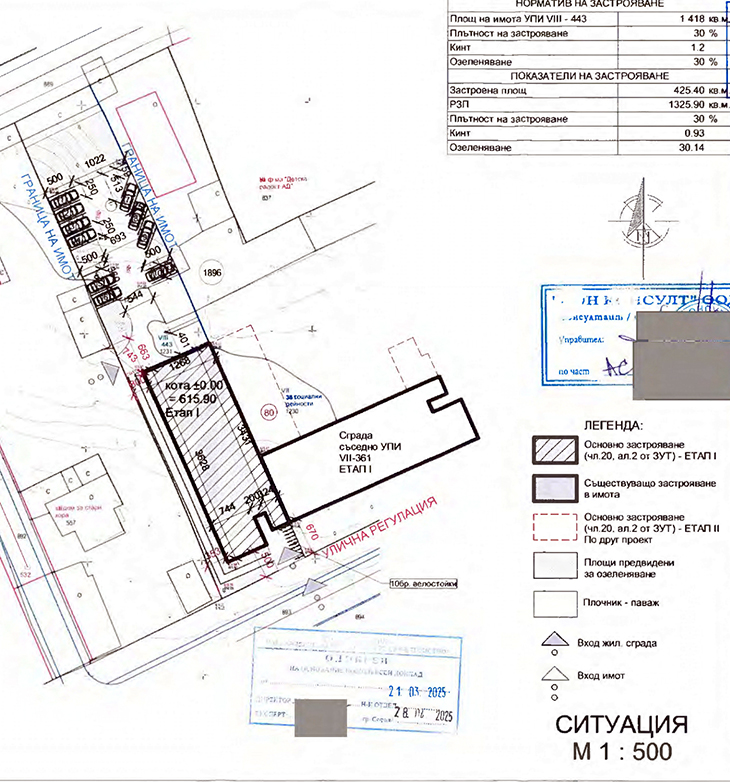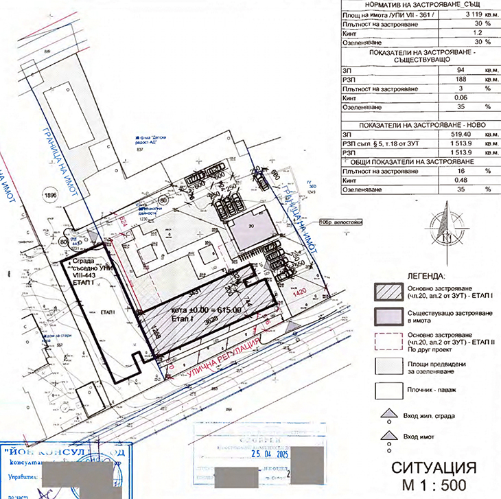 Едната сграда с правоъгълна форма и три надземни етажа в УПИ VII 361 ще бъде свързана на калкан по югозападната си фасада със съседното УПИ VIII 443, където ще е другото застрояване.