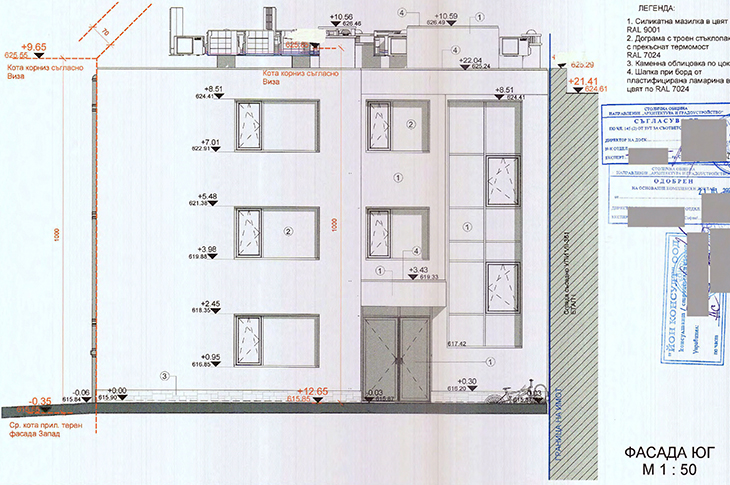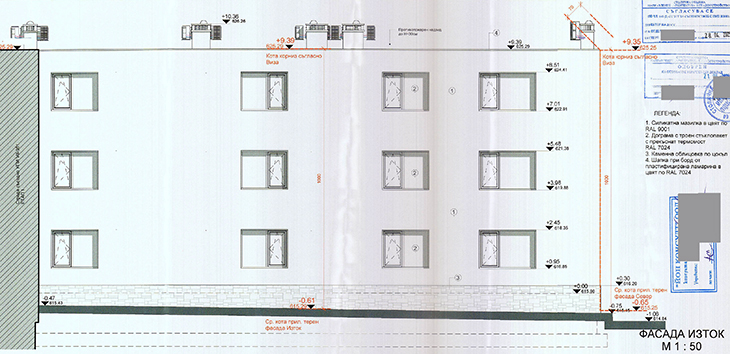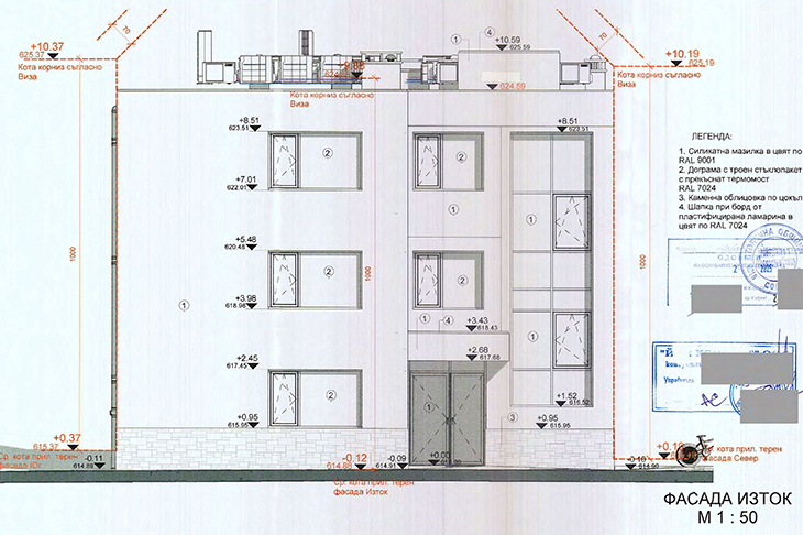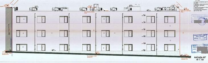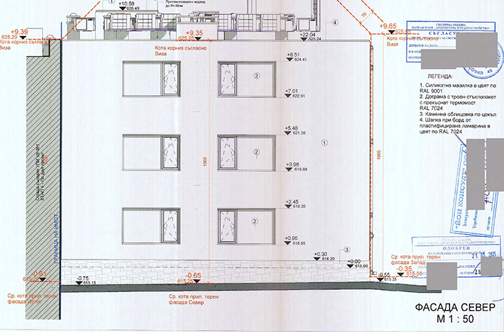 Фасадните стени ще са от тухлена зидария и мазилка в цвят близък до RAL 9001 (кремаво бежово). Цокълът до първия етаж ще бъде от каменна облицовка.