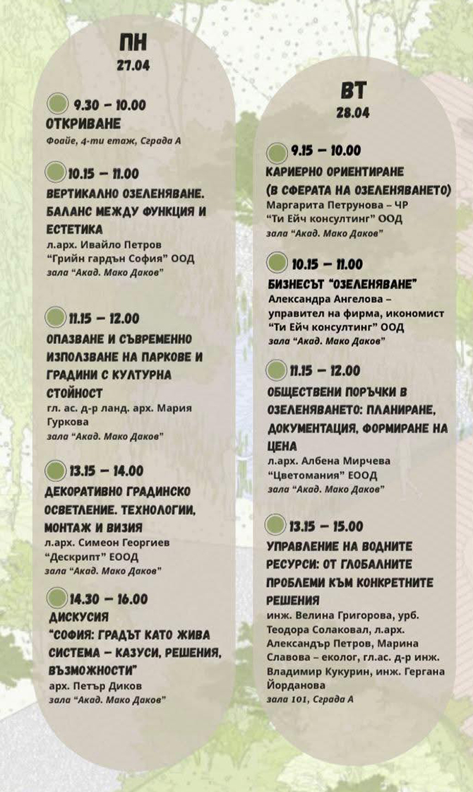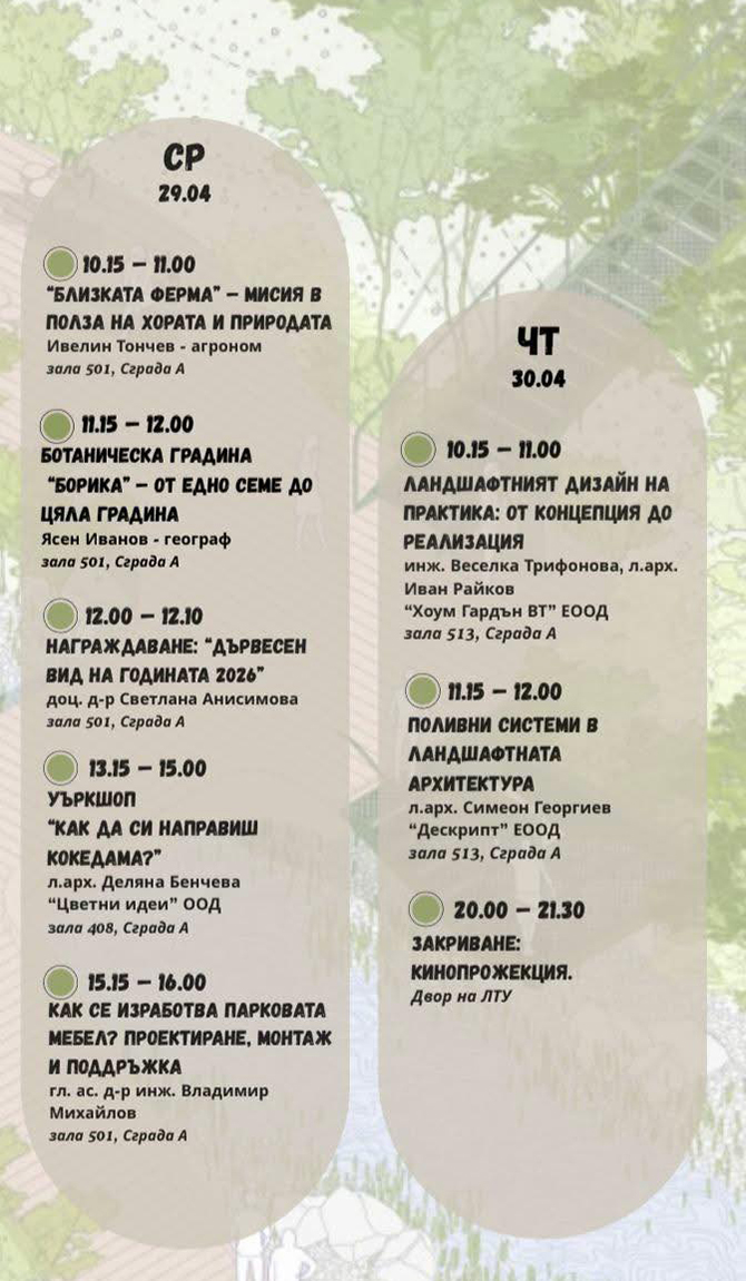 Всички събития от програмата ще се проведат в сградата на Лесотехническия университет. За подробности относно лекциите, местата и часовете на провеждане следете Facebook страницата на Landscape Architecture Week.